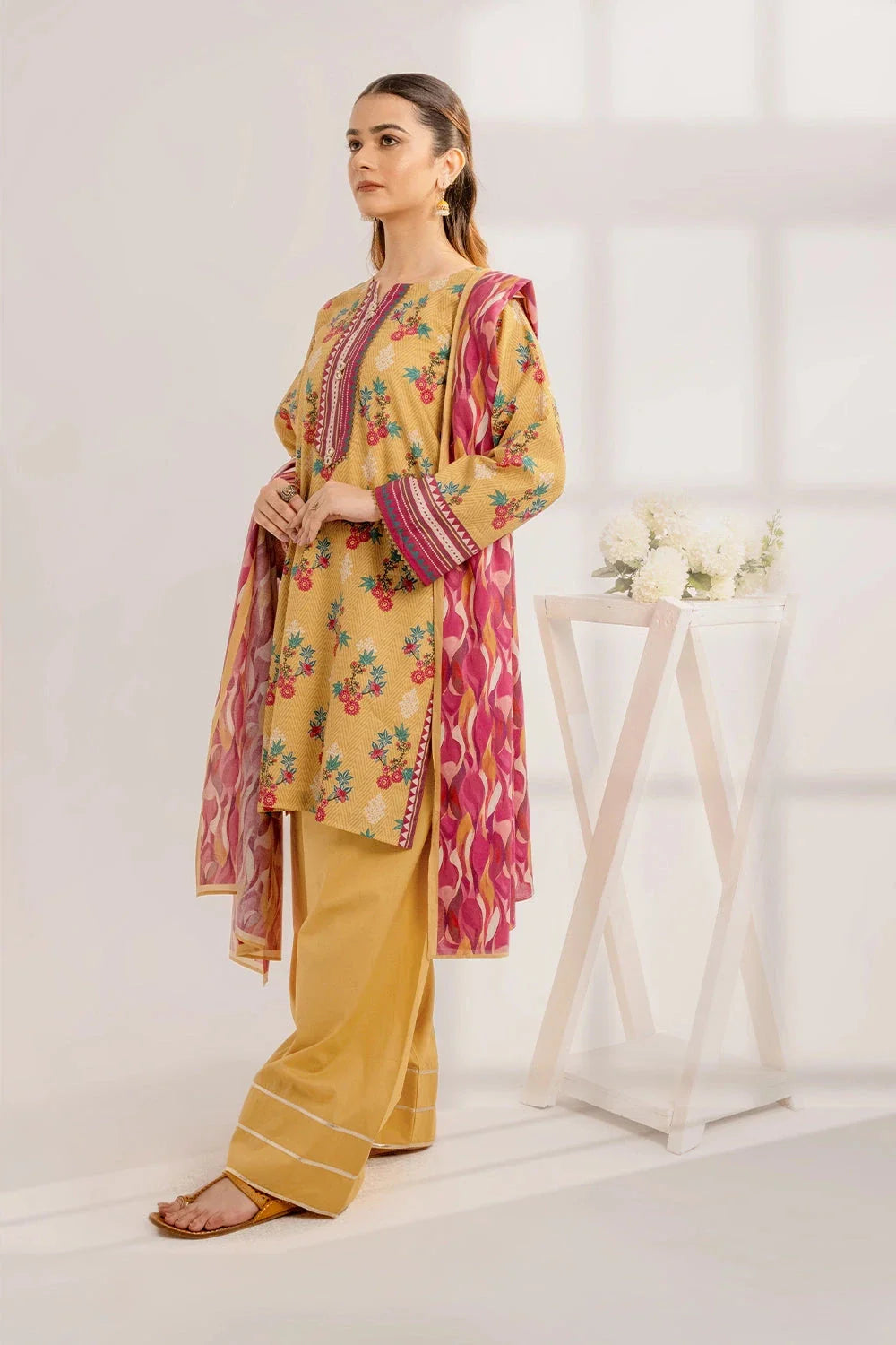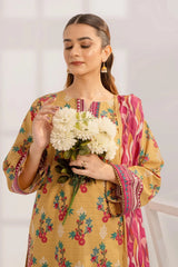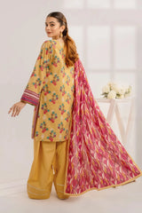 A stylish and breathable 3-piece lawn suit featuring a printed shirt, dyed trouser, and matching printed dupatta-perfect for effortless elegance and all-day comfort.