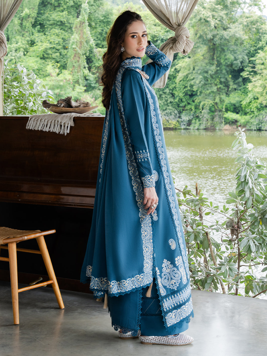 Introducing Eshal, an enchanting fusion of deep opulent teal and the timeless artistry of tribal heritage, meticulously crafted for the winter season. This exquisite ensemble is fashioned from sumptuous karandi adorned with intricate tint and shades of teal and ivory embroidery that draws inspiration from ancient motifs of Persian culture. The bold pazely design and delicate embroidery of arri work evoke a scene of a Kashmiri shawl, while the rich wintery hues infuse the ensemble with warmth and depth. This masterpiece strikes a perfect balance between timeless tradition and the sophisticated elegance of the Faiza Faisal women, enveloping the wearer in both comfort and unparalleled luxury for the colder months.