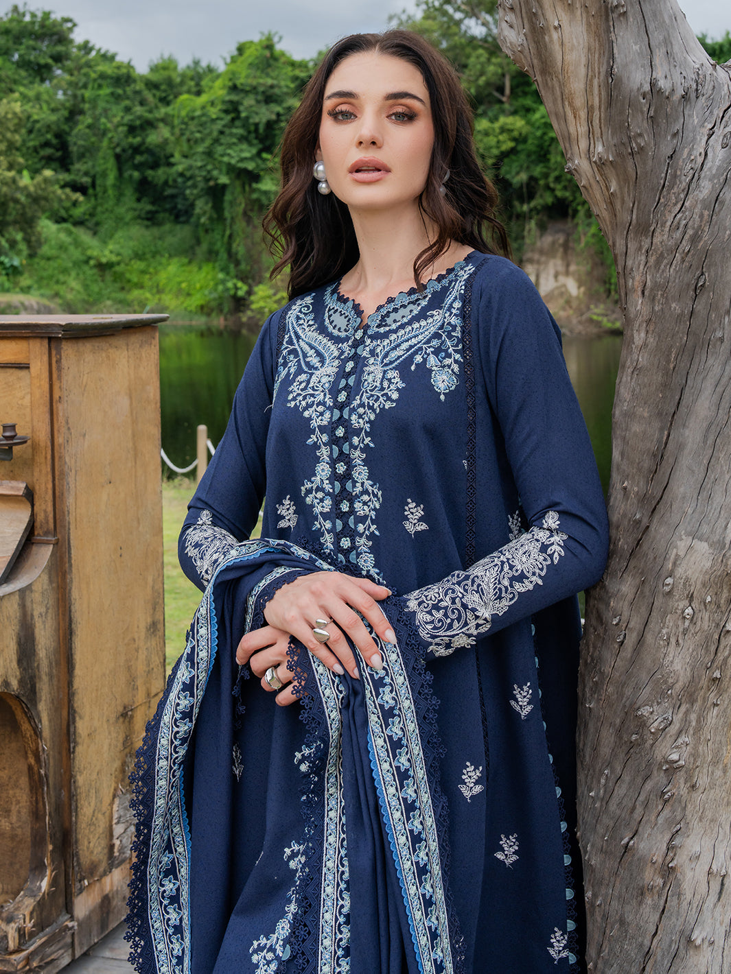 Embrace the depth of winter with our exquisite navy blue karandi set crafted from soft luxurious karandi fabric. This ensemble features delicate self colored embroidery in an intricate floral pattern. The shirt boasts a wonderful motif that extends to an open shirt neckline offering a sophisticated look. Paired with coordinating straight trousers and a heavy embroidered karandi shawl this outfit provides unmatched warmth and timeless elegance for any occasion.