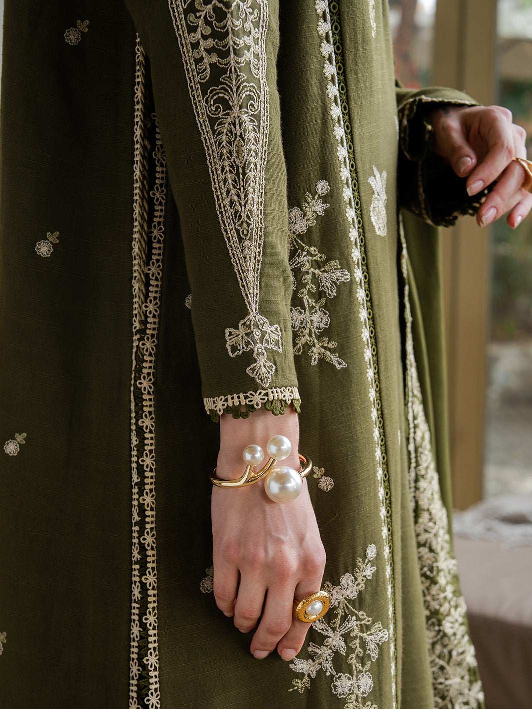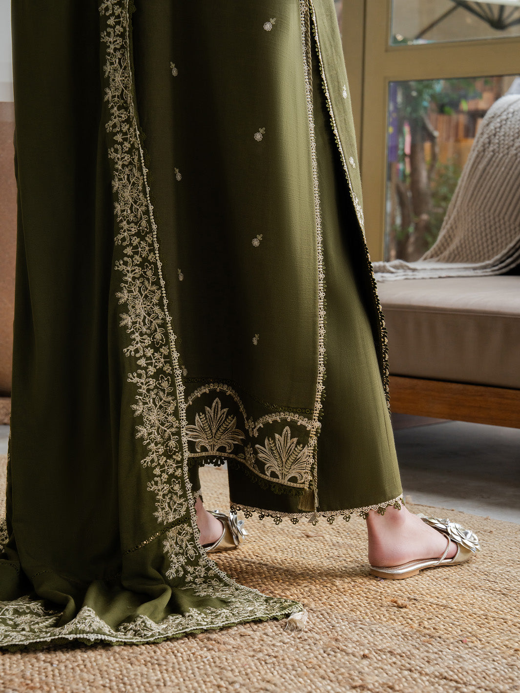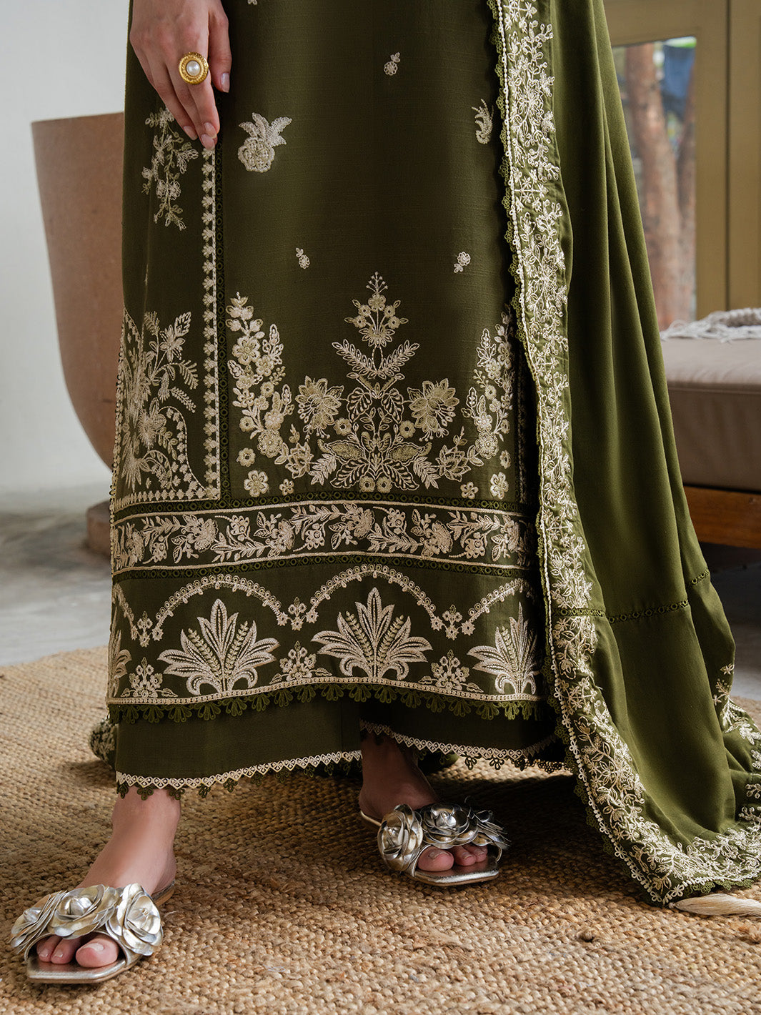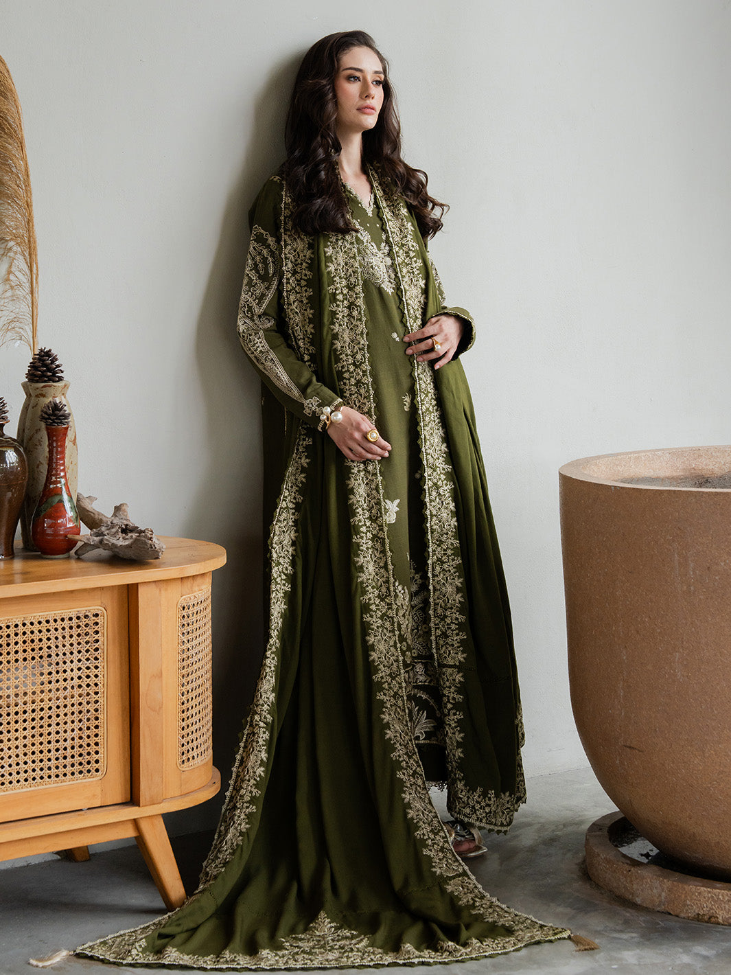 Wrap yourself in timeless elegance with this embroidered slub khaddar ensemble. Featuring intricate embroidery on the front, back, and sleeves with delicate organza details, paired with a dyed slub khaddar trouser and an embroidered twill shawl for a luxurious winter look. Perfect blend of comfort, warmth, and sophistication.